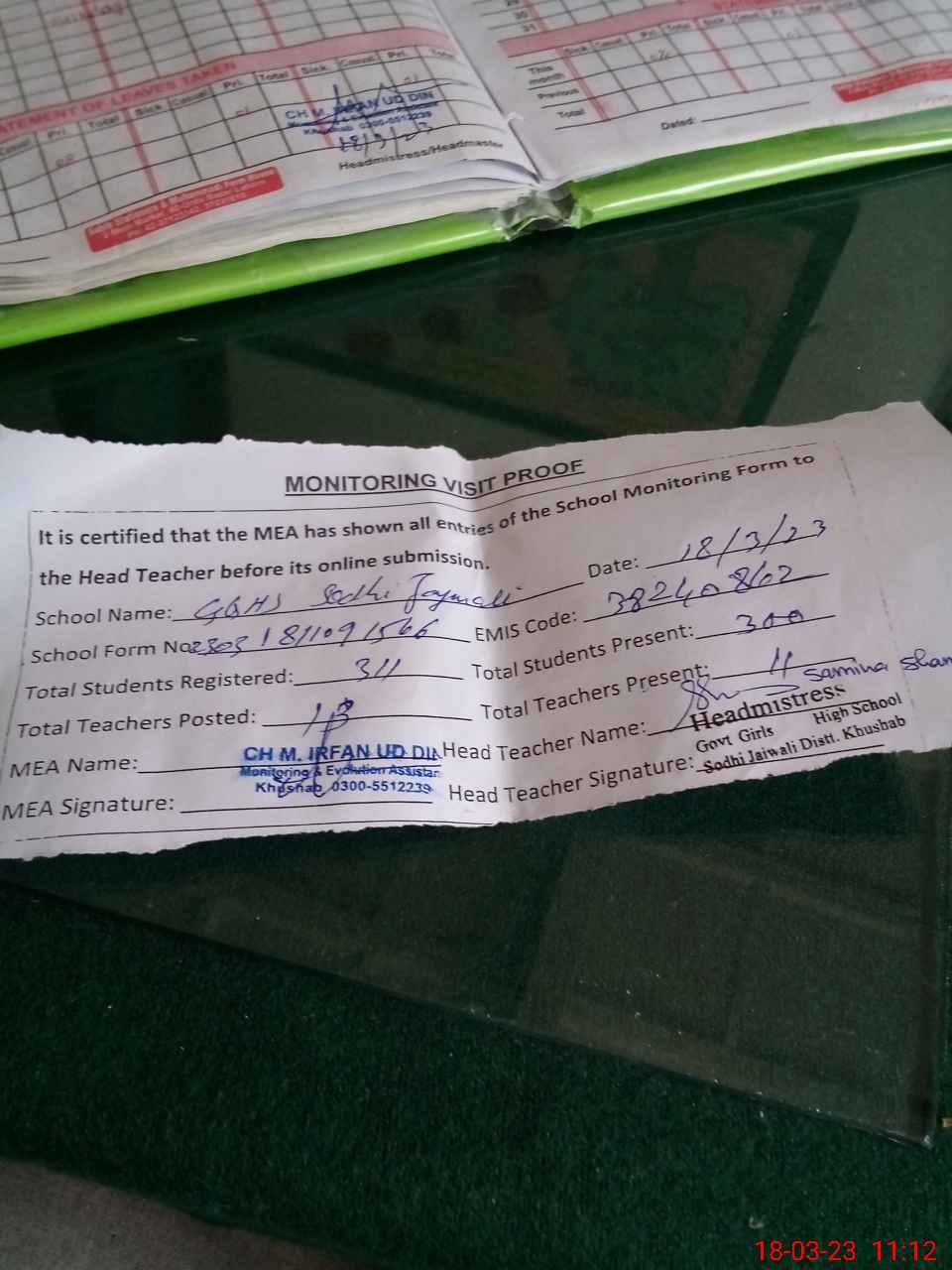 | Attendance Register | Head Teacher | MEA with School | Visit Proof |