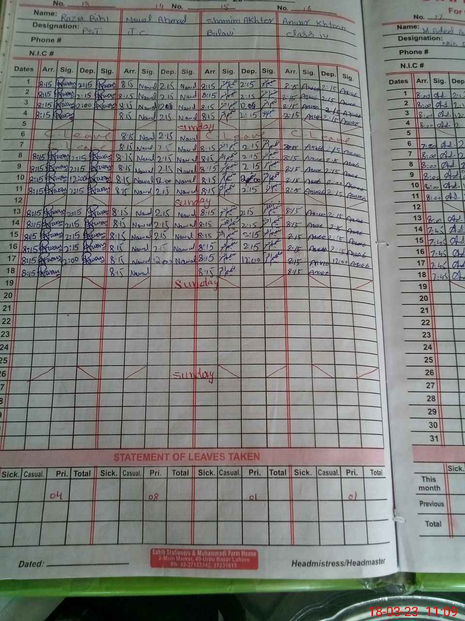 | CNIC | Full Name | Designation | R/C | Absence During Last Calender Month |