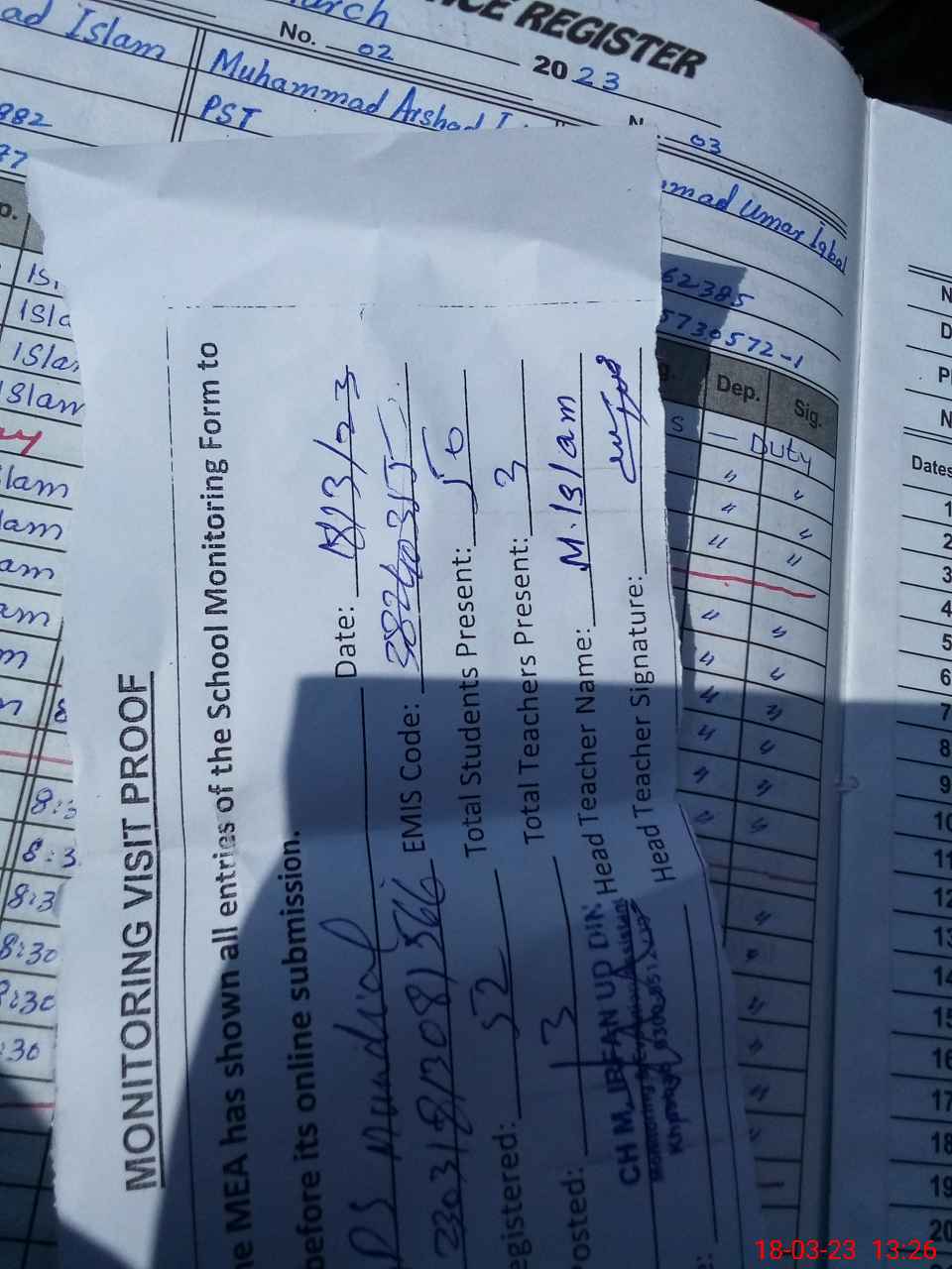 | Attendance Register | Head Teacher | MEA with School | Visit Proof |
