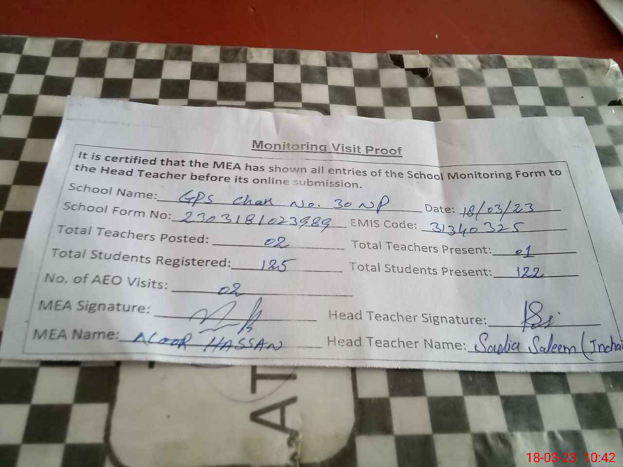 | Attendance Register | Head Teacher | MEA with School | Visit Proof |