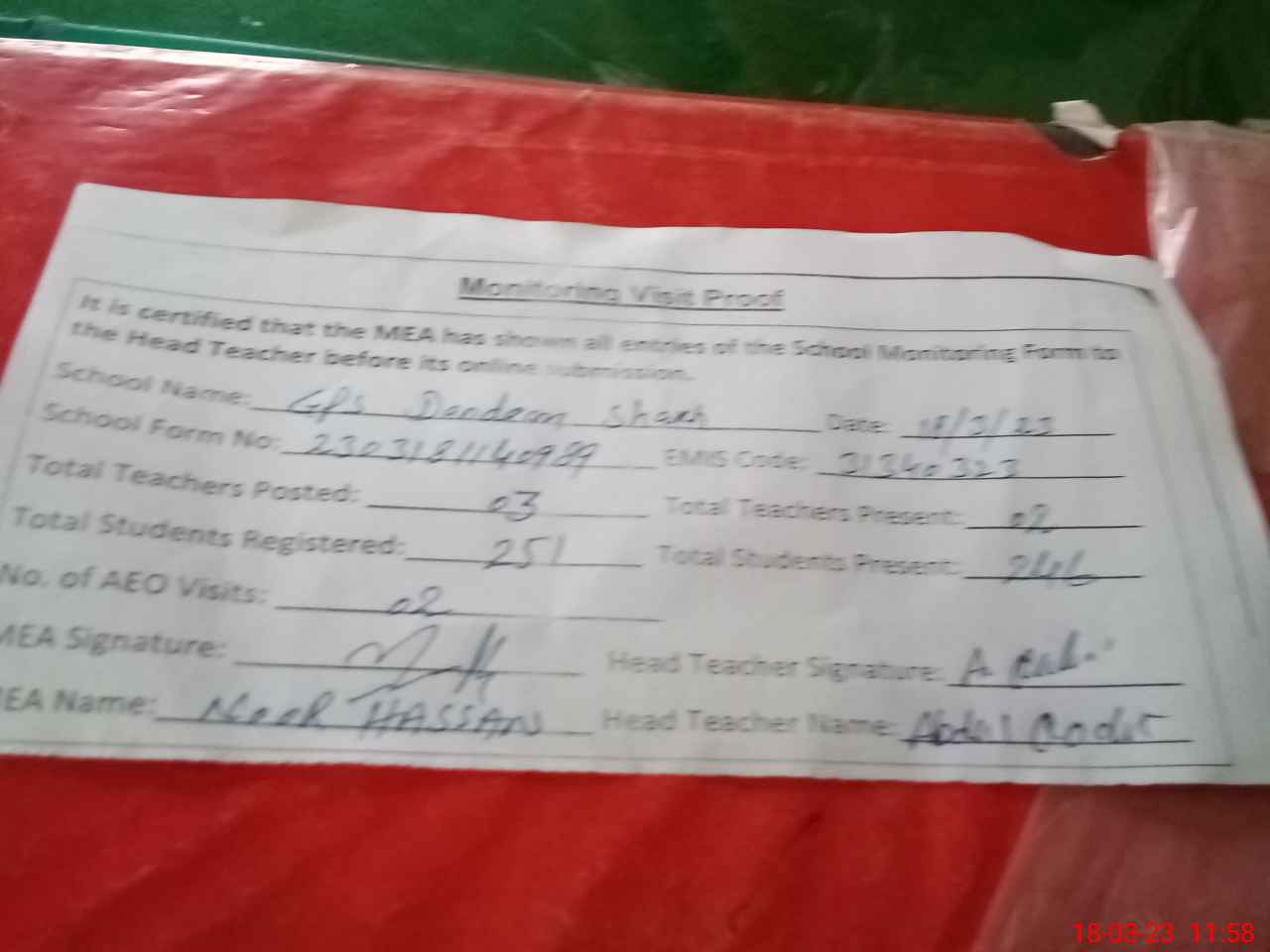 | Attendance Register | Head Teacher | MEA with School | Visit Proof |