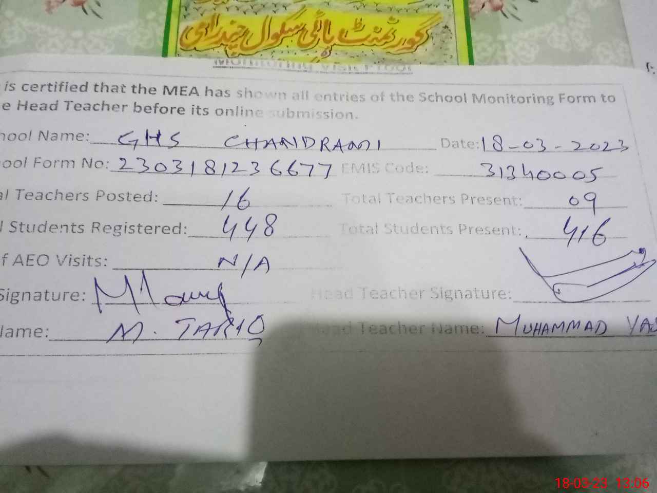 | Certified that this School was Inspected by the Undersigned MEA/DMO Today and the Information Stated Above is as Per Record. | |||||