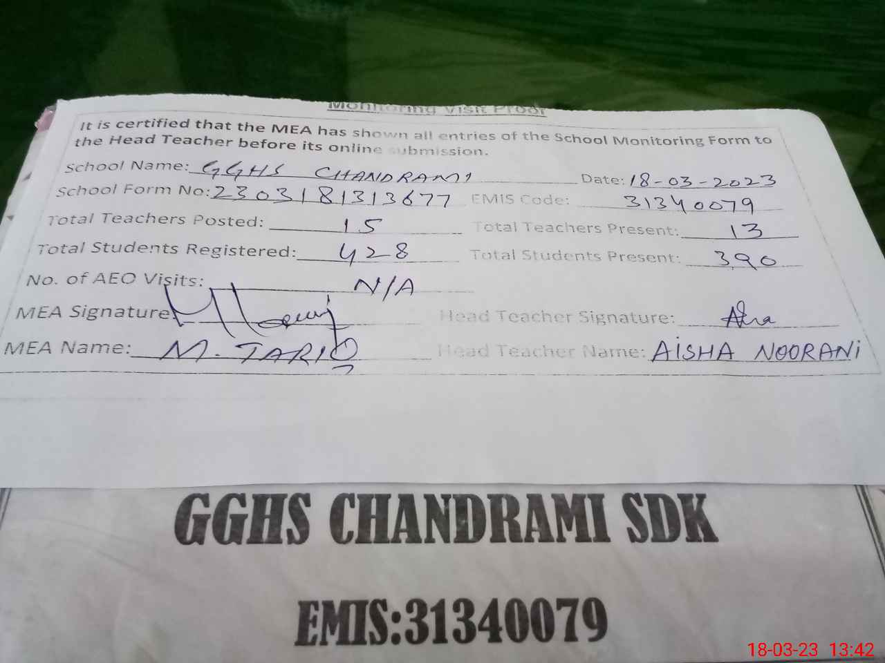 | Attendance Register | Head Teacher | MEA with School | Visit Proof |