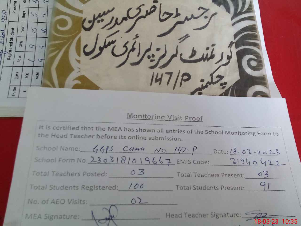 | Attendance Register | Head Teacher | MEA with School | Visit Proof |