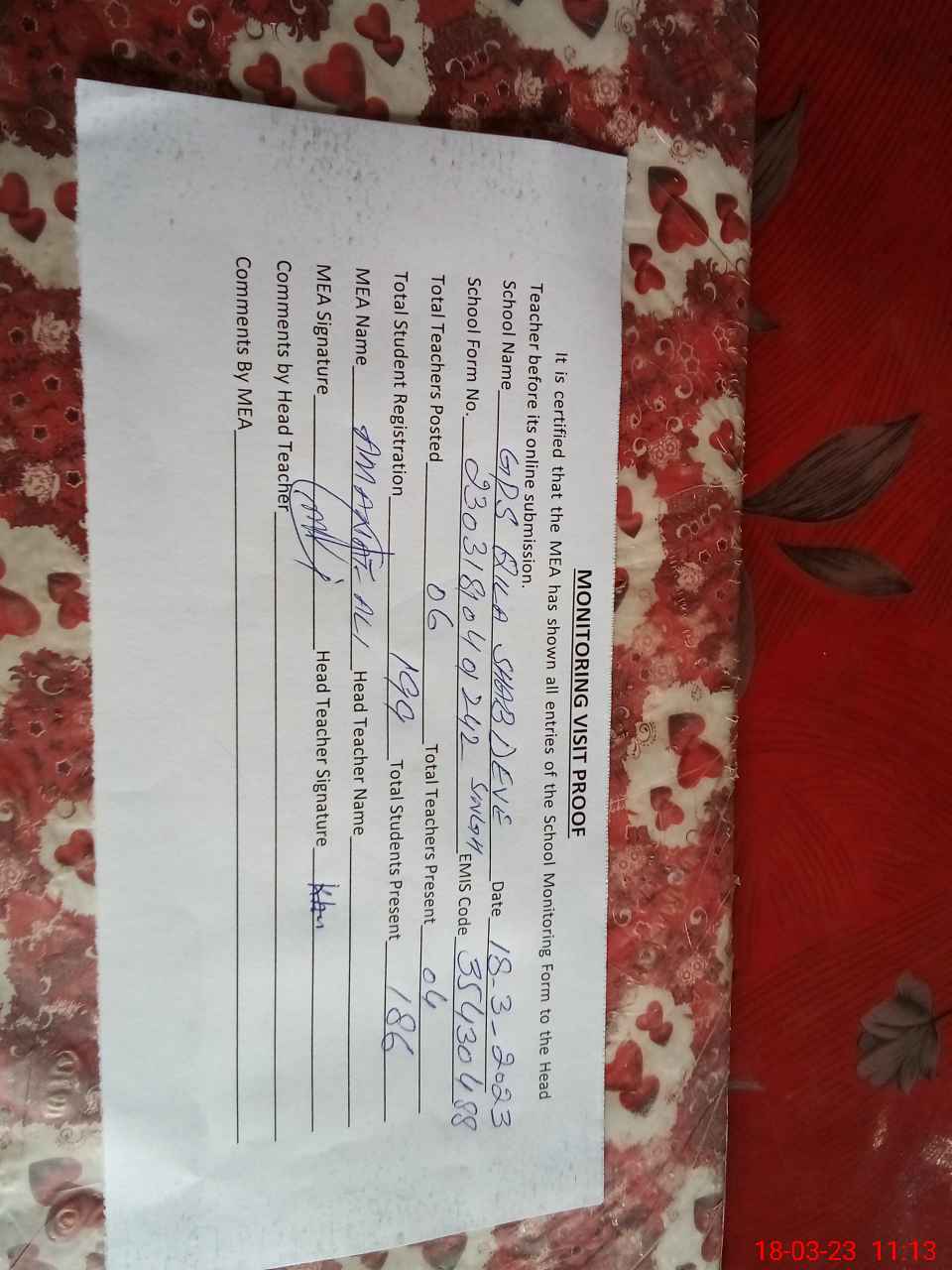 | Attendance Register | Head Teacher | MEA with School | Visit Proof |