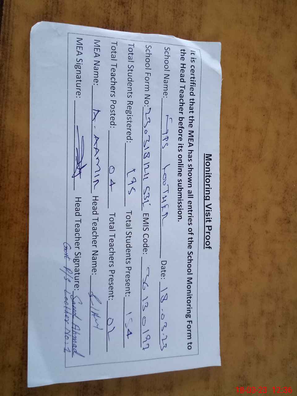 | Attendance Register | Head Teacher | MEA with School | Visit Proof |