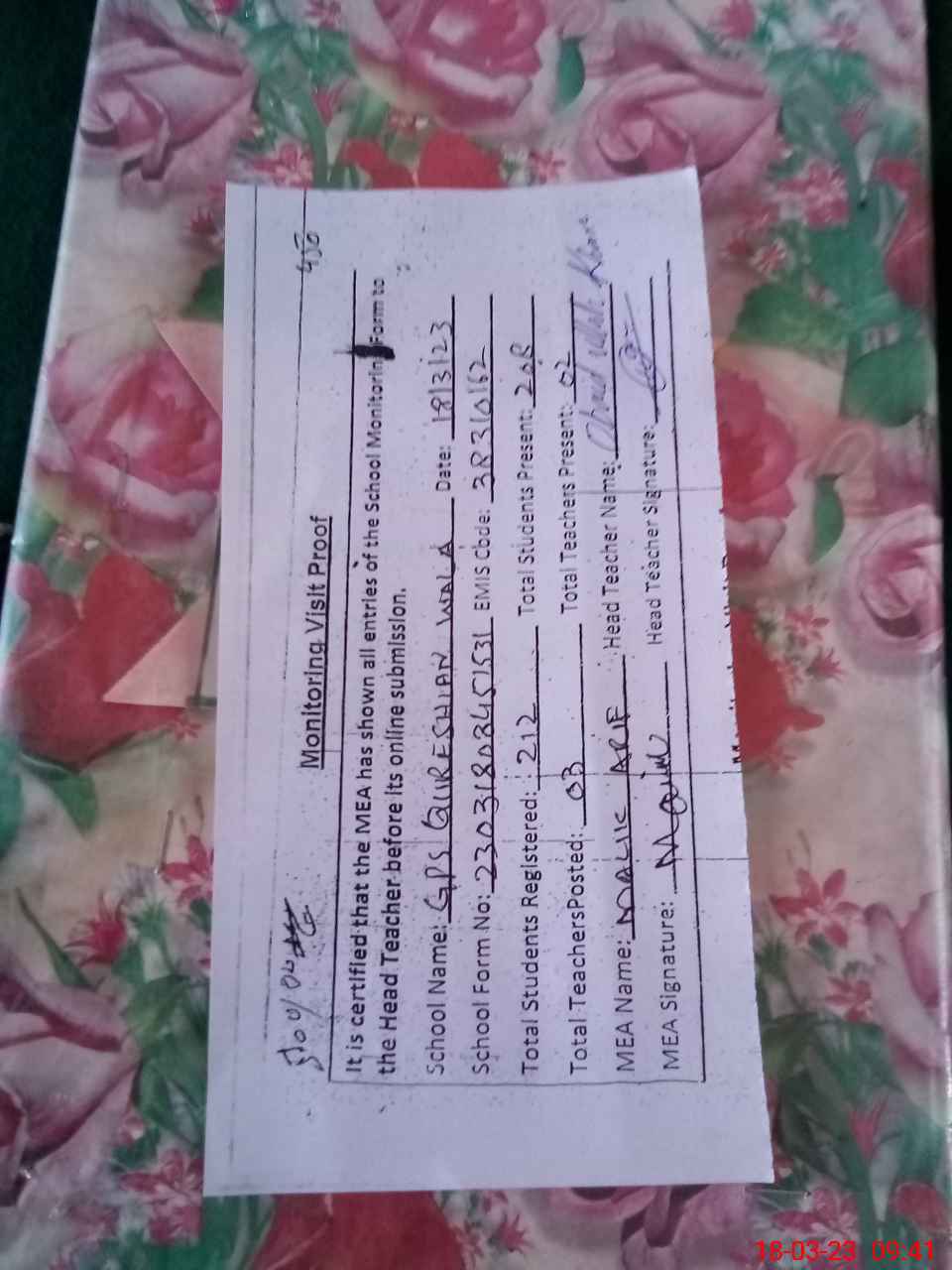 | Attendance Register | Head Teacher | MEA with School | Visit Proof |