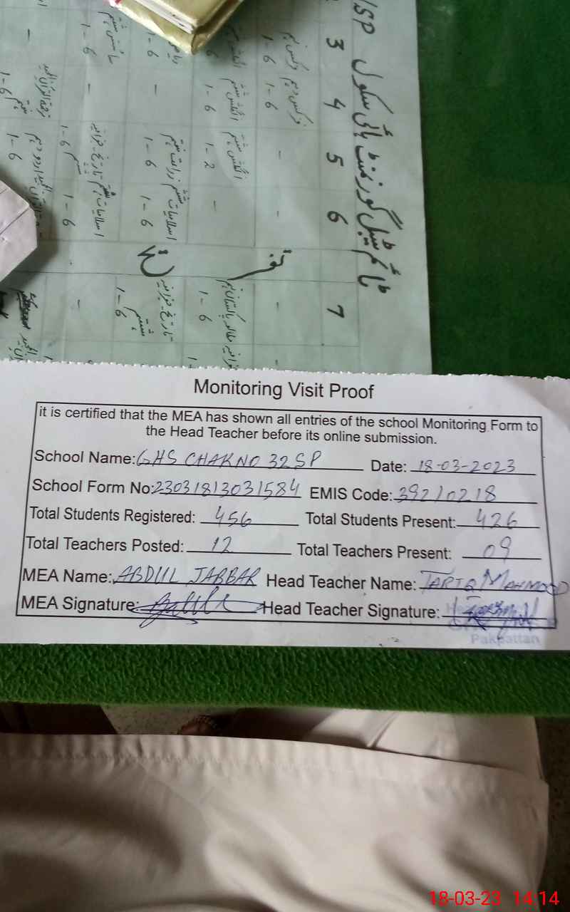 | EMIS Code: 39210218 | Name of School: GHS CHAK NO. 32 SP | |||