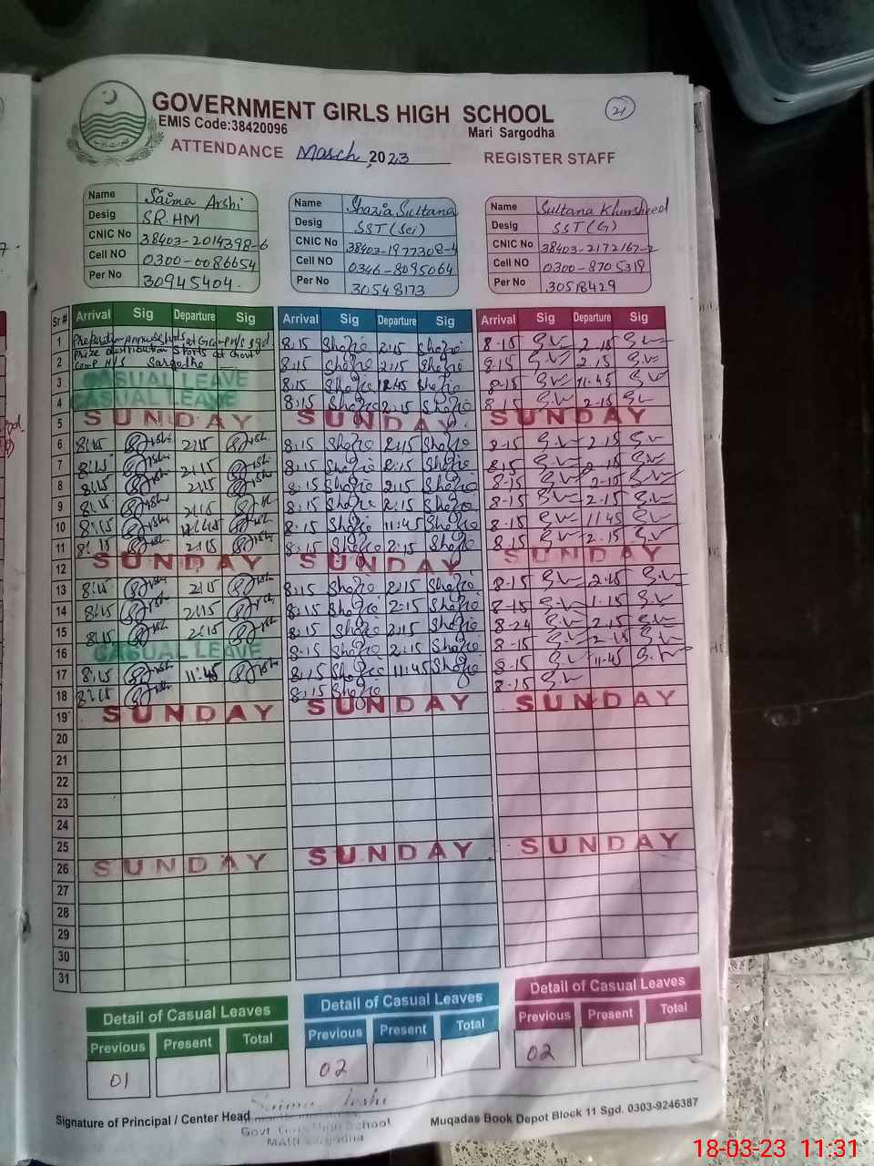 | CNIC | Full Name | Designation | R/C | Absence During Last Calender Month |