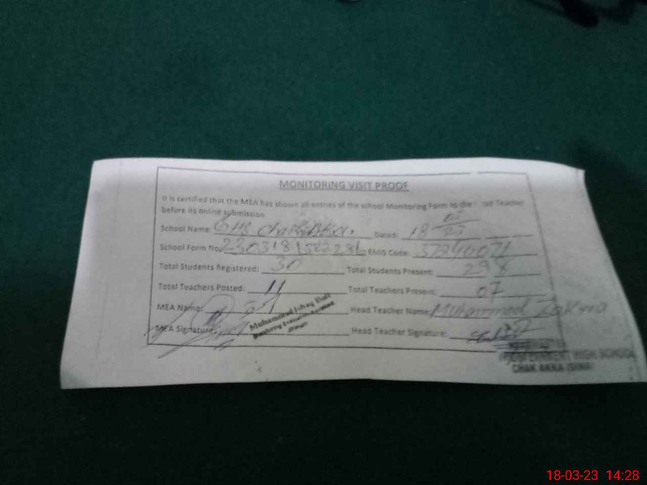 | Attendance Register | Head Teacher | MEA with School | Visit Proof |