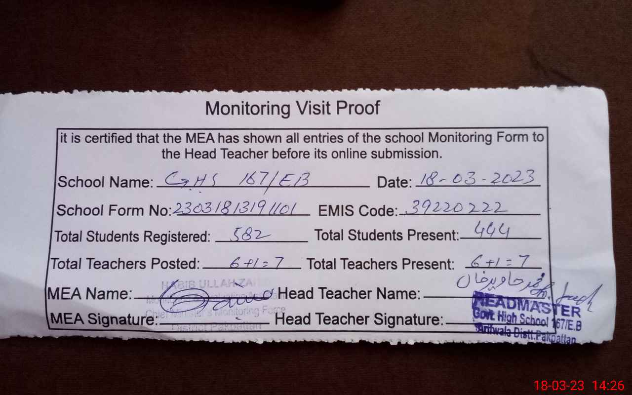 | Attendance Register | Head Teacher | MEA with School | Visit Proof |