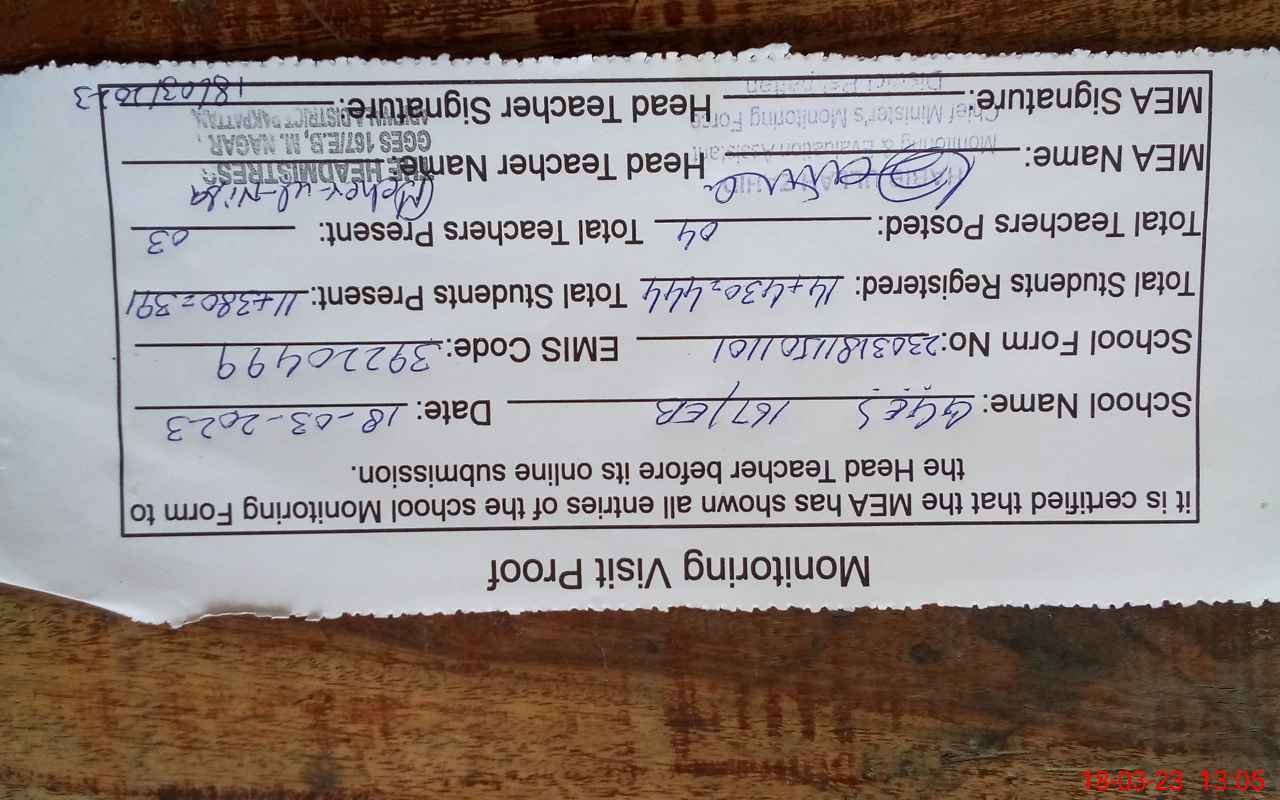 | EMIS Code: 39220499 | Name of School: GGES CHAK NO.167 EB | |||