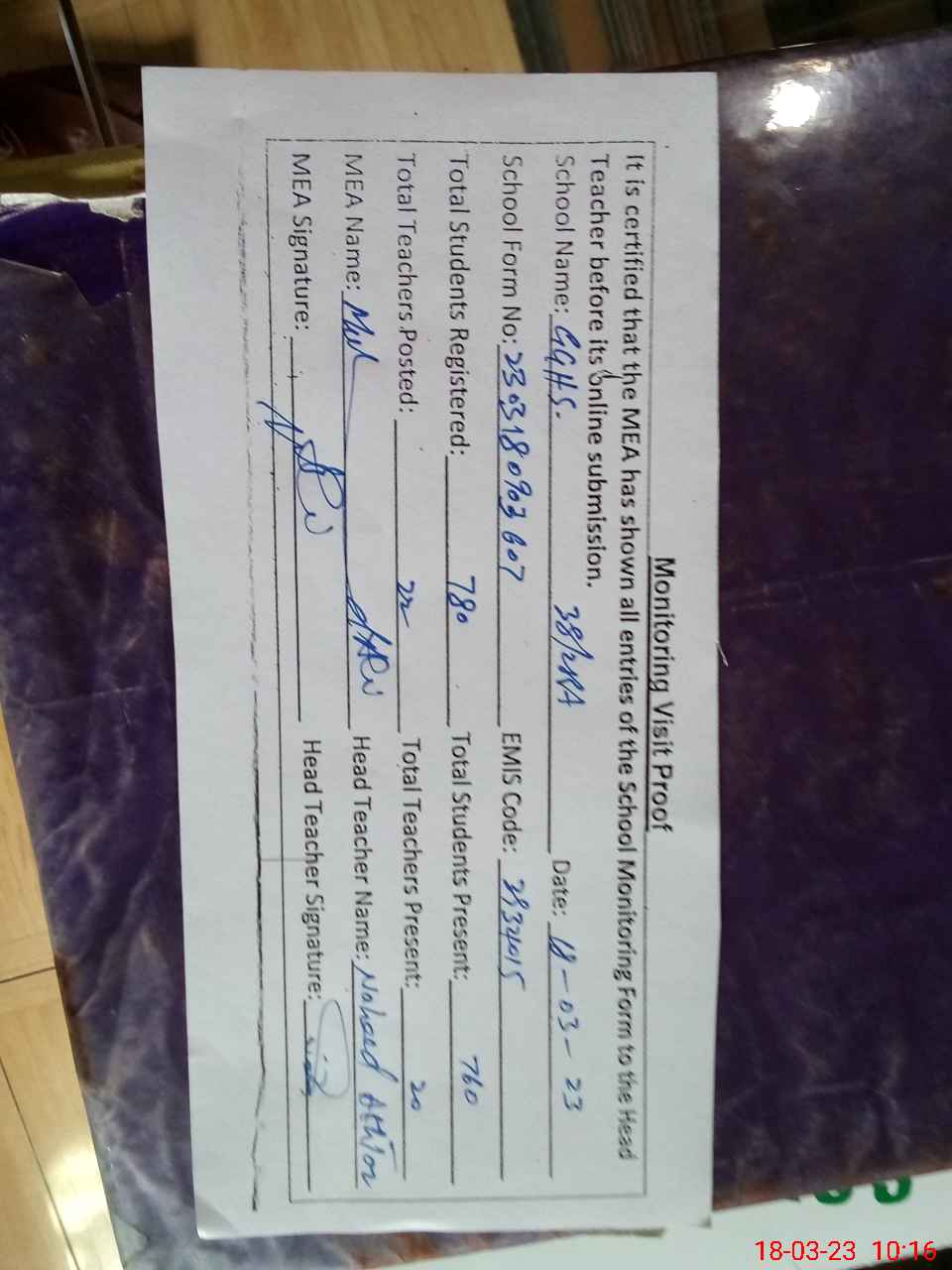 | Attendance Register | Head Teacher | MEA with School | Visit Proof |