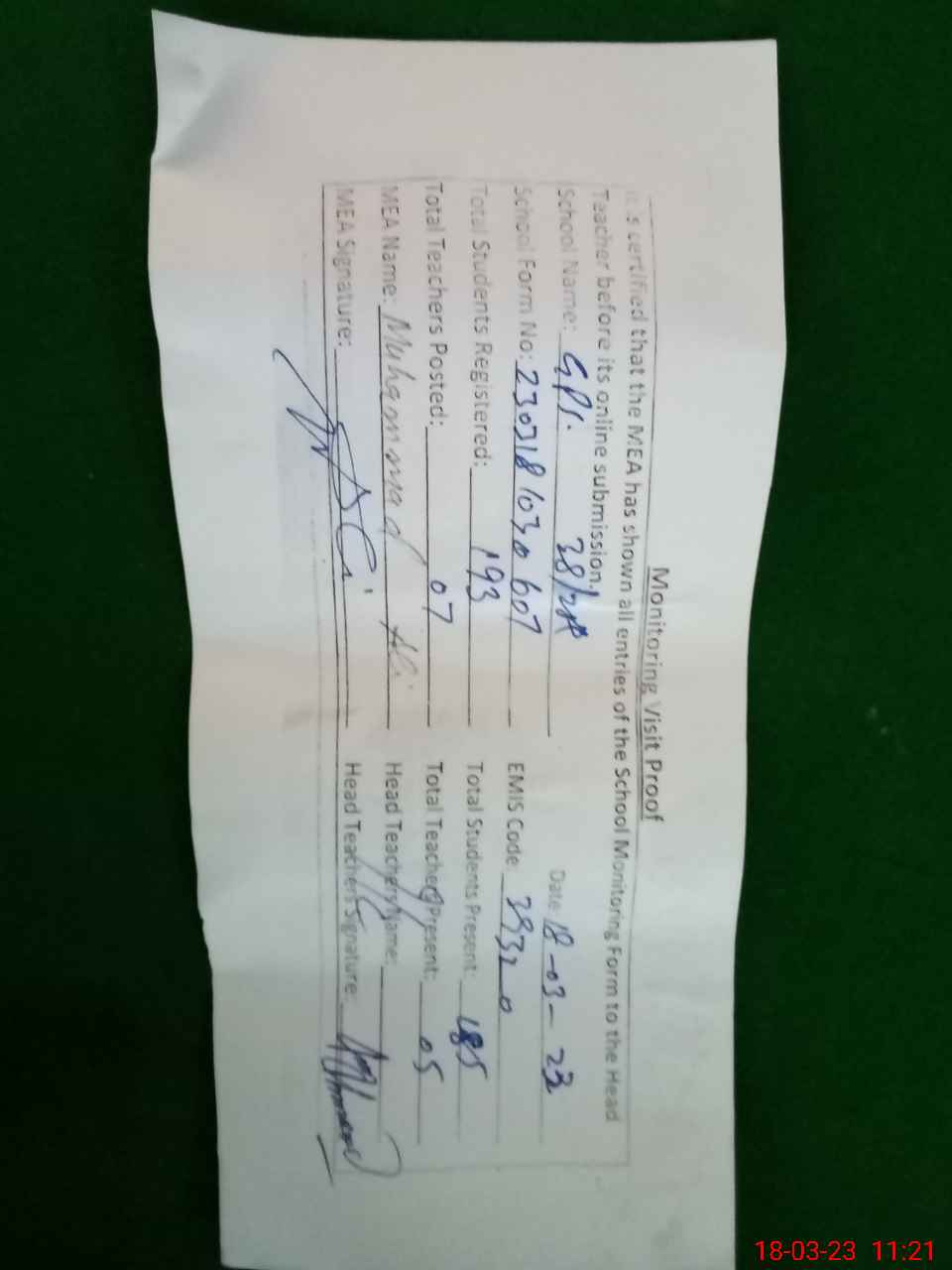 | Attendance Register | Head Teacher | MEA with School | Visit Proof |