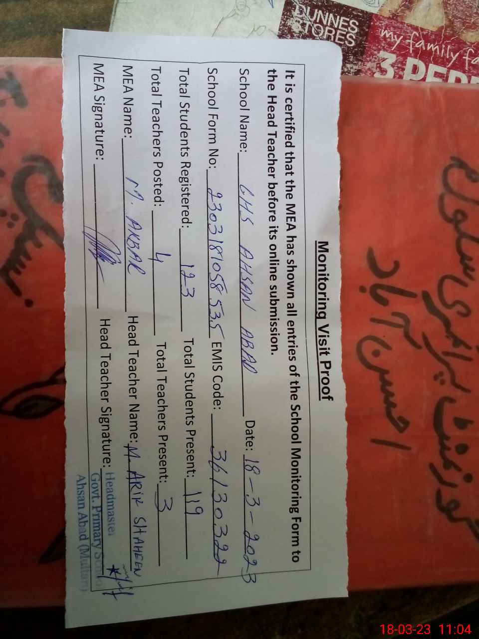 | Attendance Register | Head Teacher | MEA with School | Visit Proof |