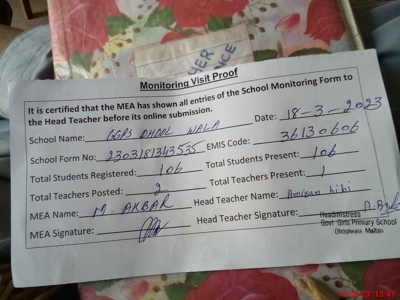 | Attendance Register | Head Teacher | MEA with School | Visit Proof |