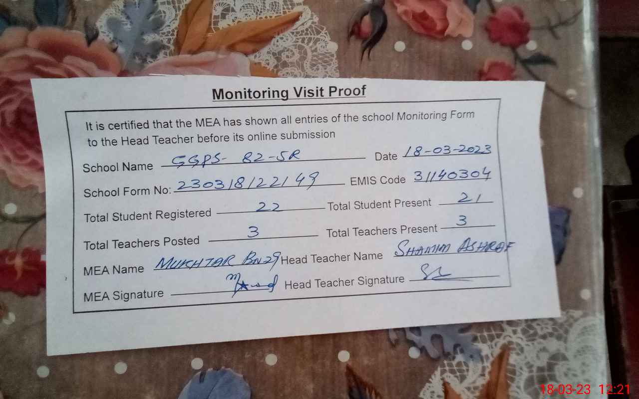 | Attendance Register | Head Teacher | MEA with School | Visit Proof |
