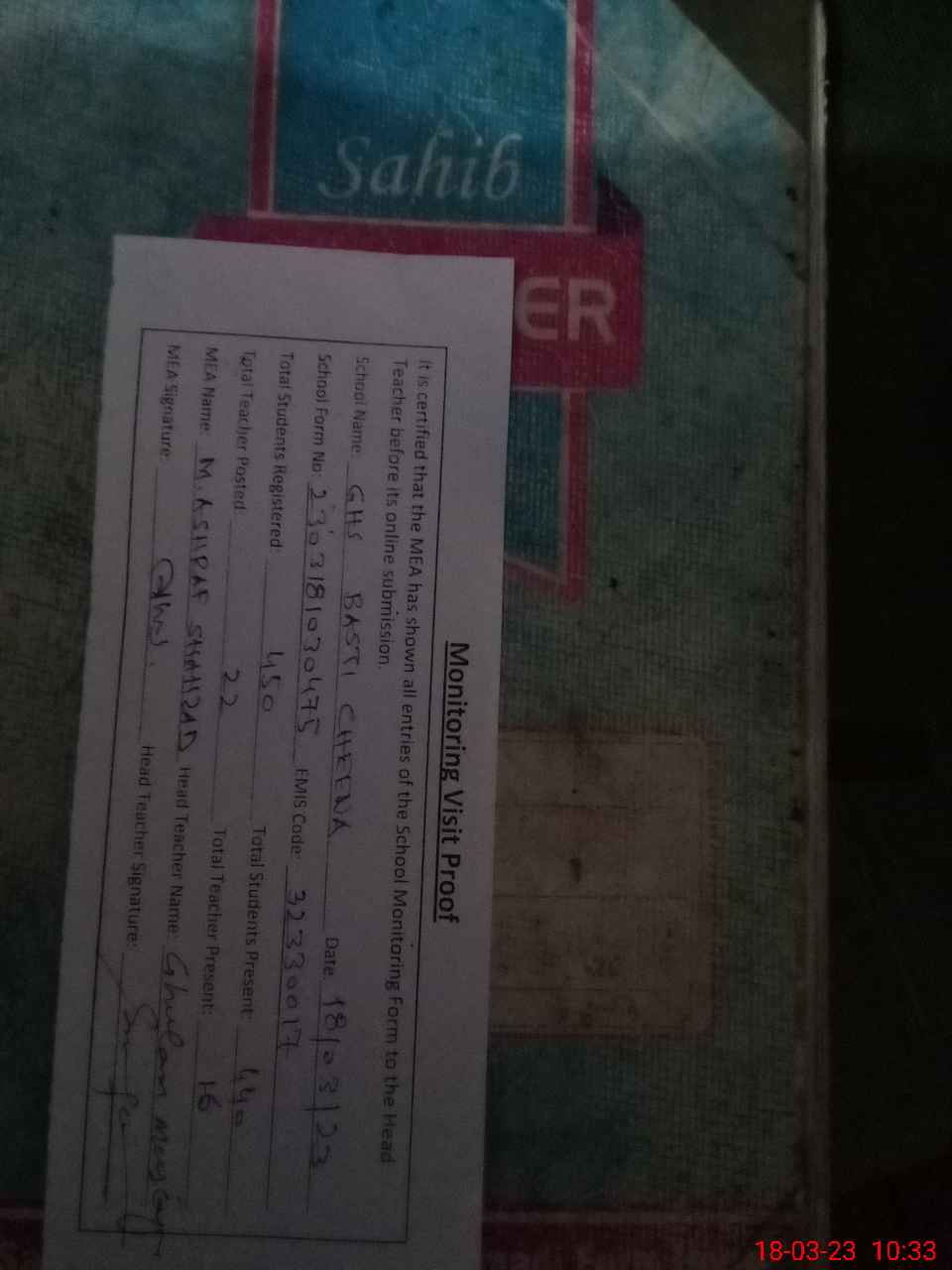 | Attendance Register | Head Teacher | MEA with School | Visit Proof |