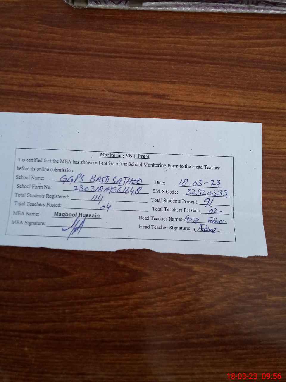 | Attendance Register | Head Teacher | MEA with School | Visit Proof |