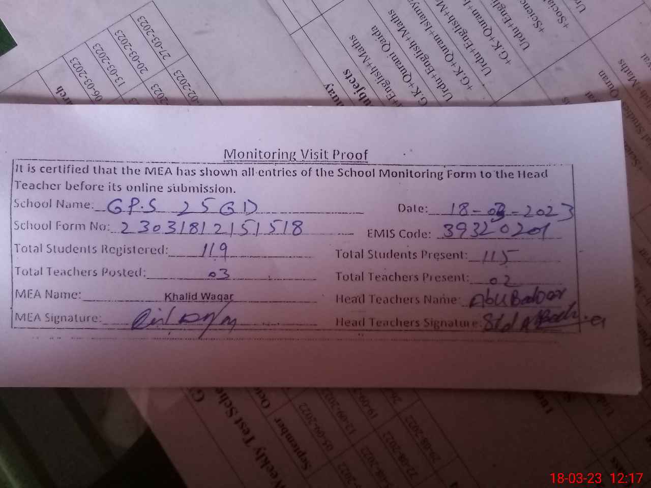 | Attendance Register | Head Teacher | MEA with School | Visit Proof |