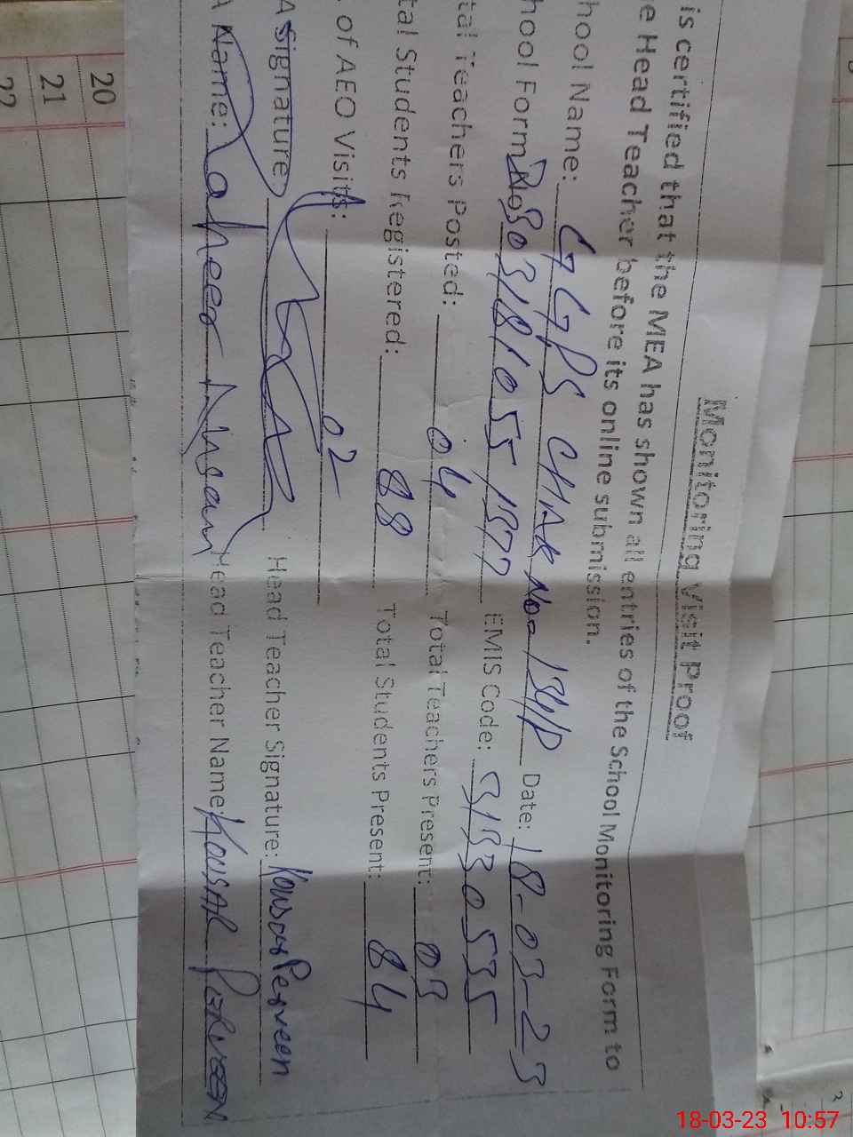 | Attendance Register | Head Teacher | MEA with School | Visit Proof |