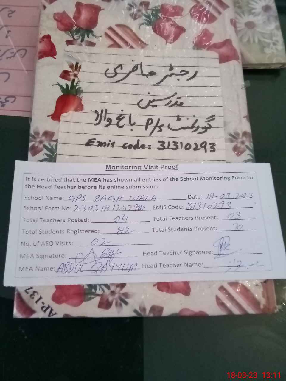 | Attendance Register | Head Teacher | MEA with School | Visit Proof |