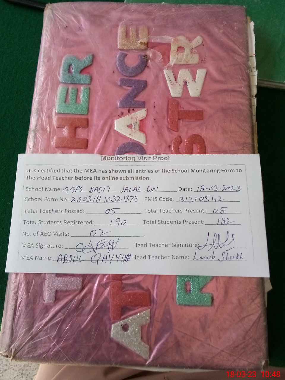 | Attendance Register | Head Teacher | MEA with School | Visit Proof |