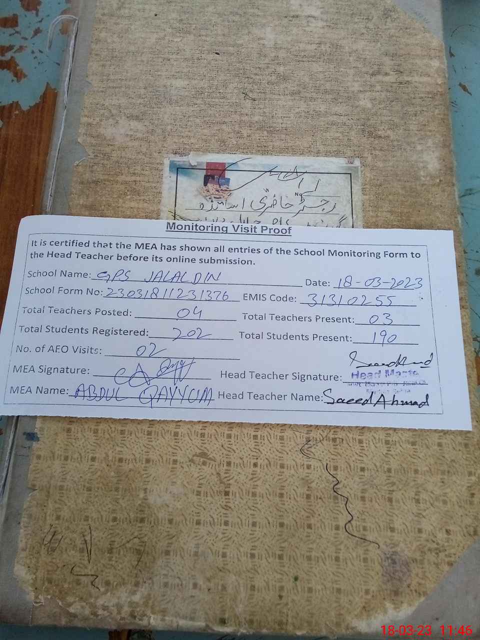 | Attendance Register | Head Teacher | MEA with School | Visit Proof |