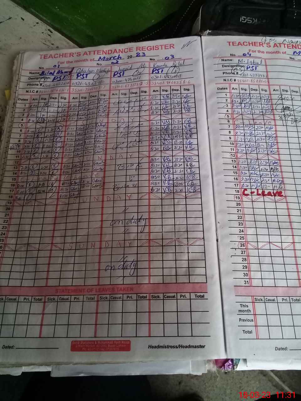 | CNIC | Full Name | Designation | R/C | Absence During Last Calender Month |