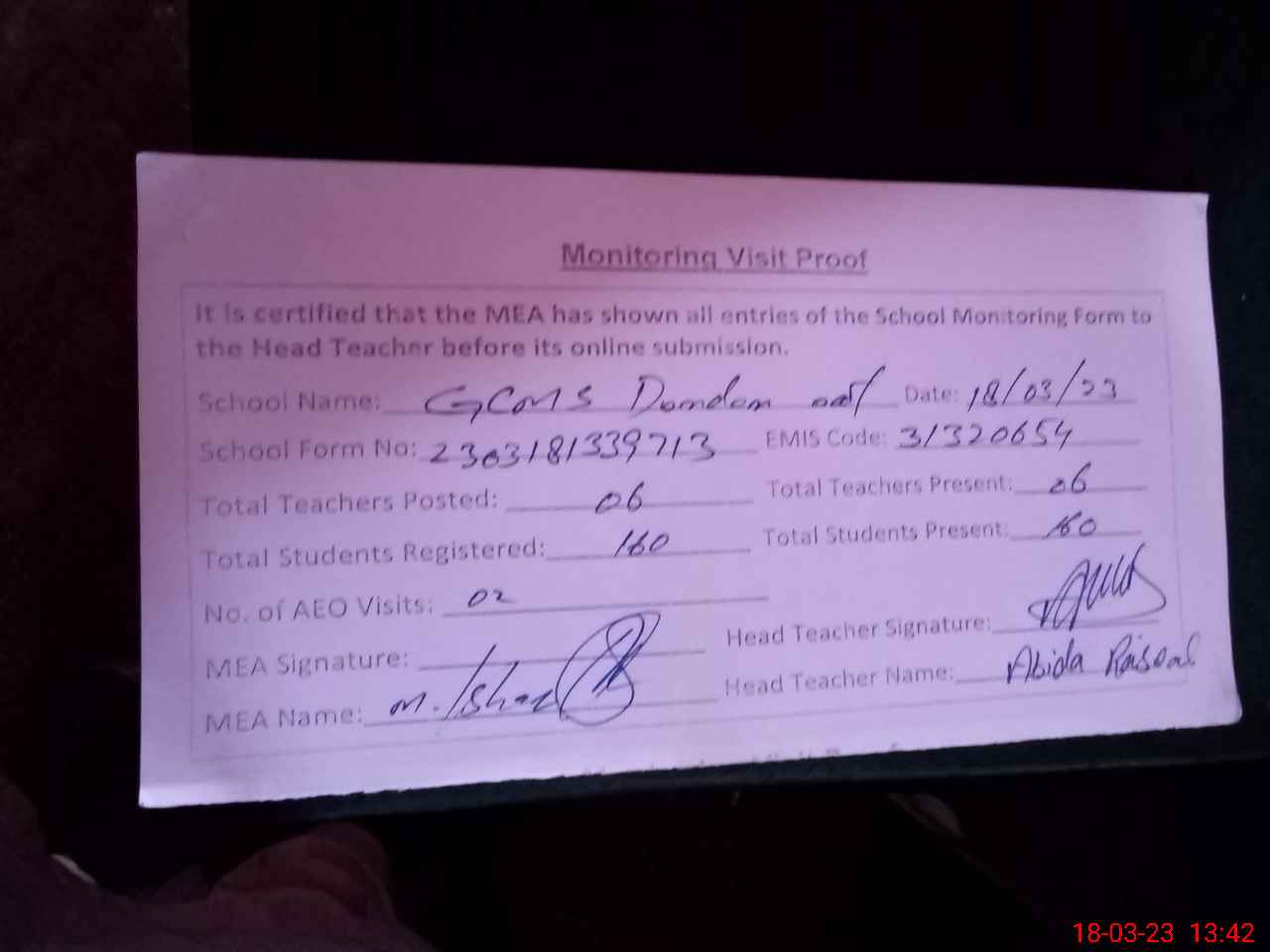 | Certified that this School was Inspected by the Undersigned MEA/DMO Today and the Information Stated Above is as Per Record. | |||||