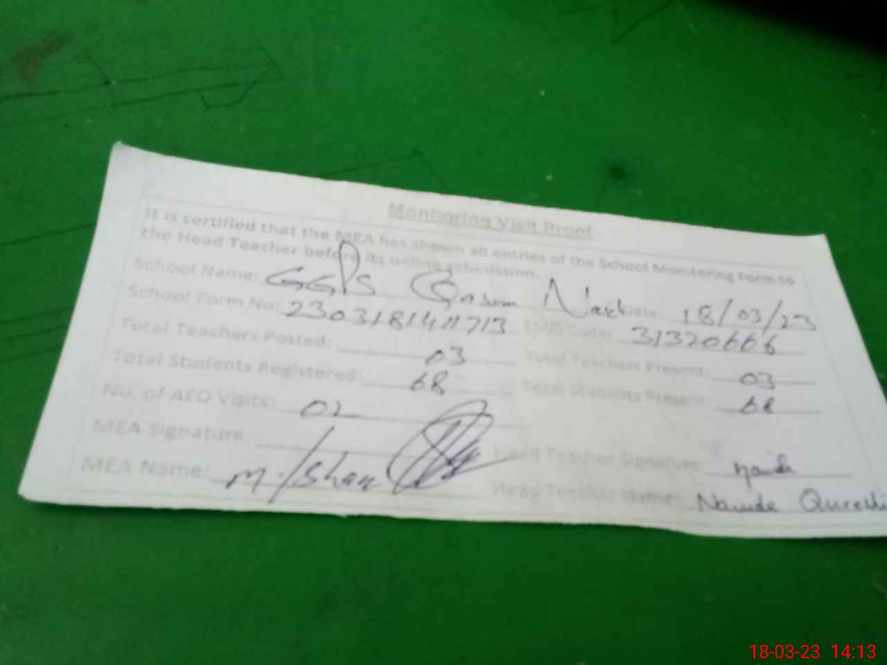 | Attendance Register | Head Teacher | MEA with School | Visit Proof |