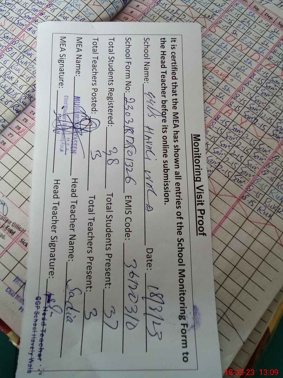 | Attendance Register | Head Teacher | MEA with School | Visit Proof |