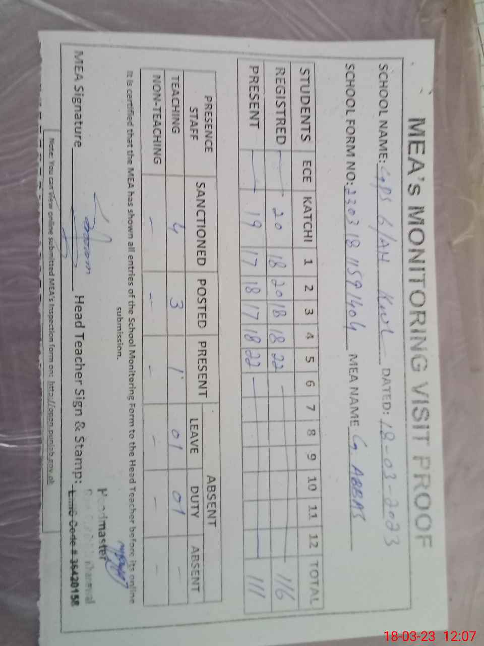 | Attendance Register | Head Teacher | MEA with School | Visit Proof |