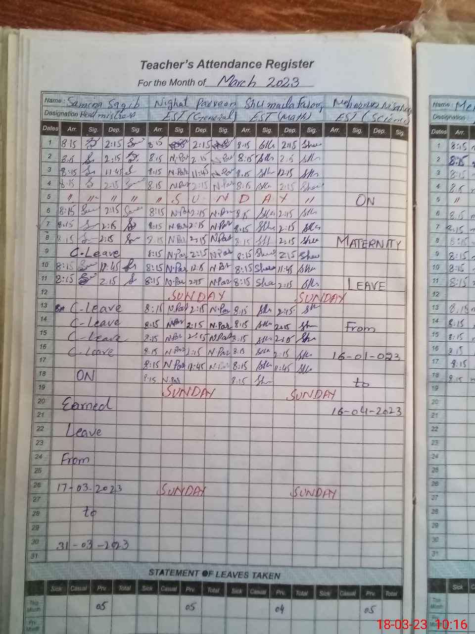 | Leave | Duty | Absent | Maternity | Medical | Ex- Pak |