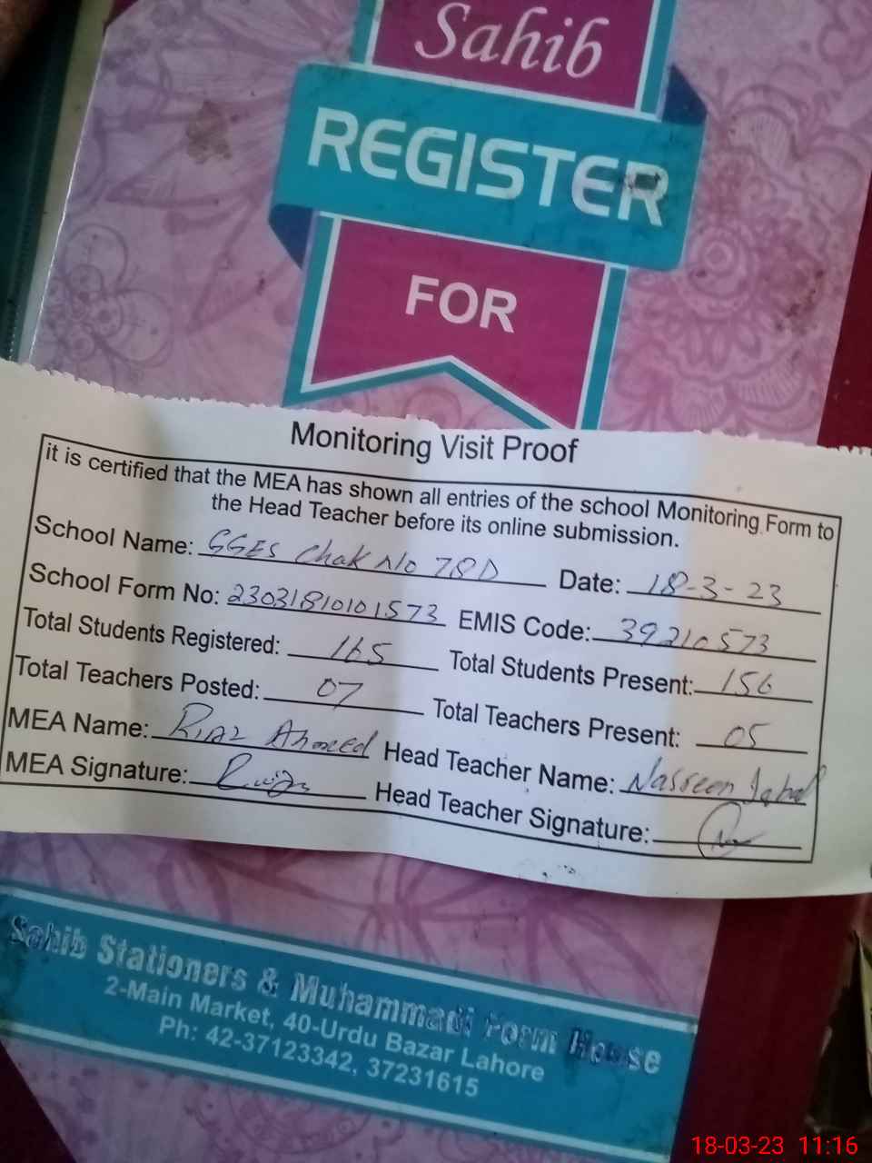 | Attendance Register | Head Teacher | MEA with School | Visit Proof |