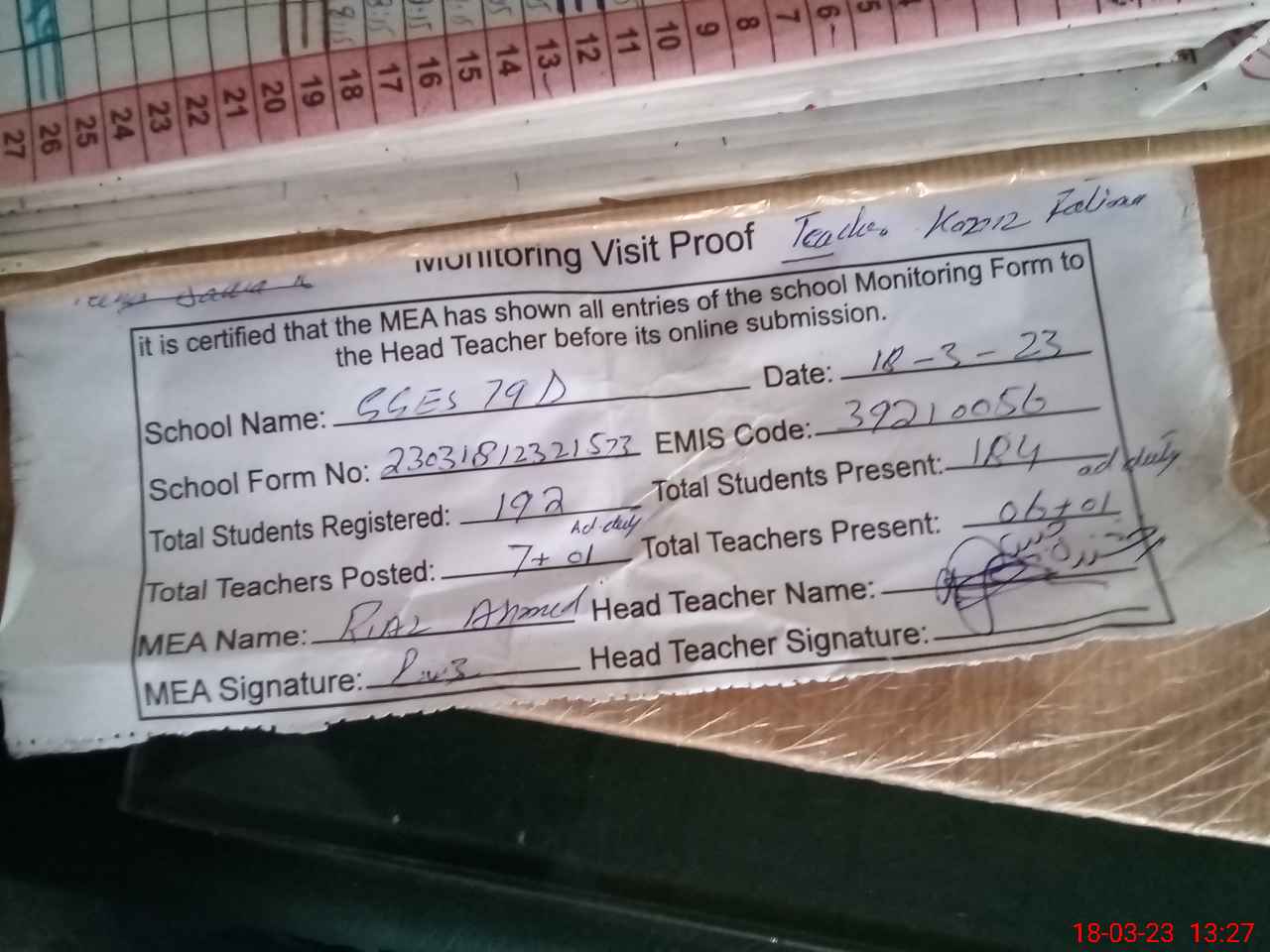 | Attendance Register | Head Teacher | MEA with School | Visit Proof |