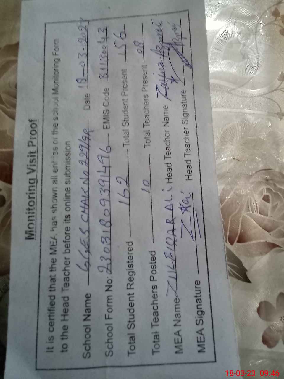 | Name: Za**** Designation: (School Headmaster's/Headmistress's) SST Phone/Cell Number: 03**** |