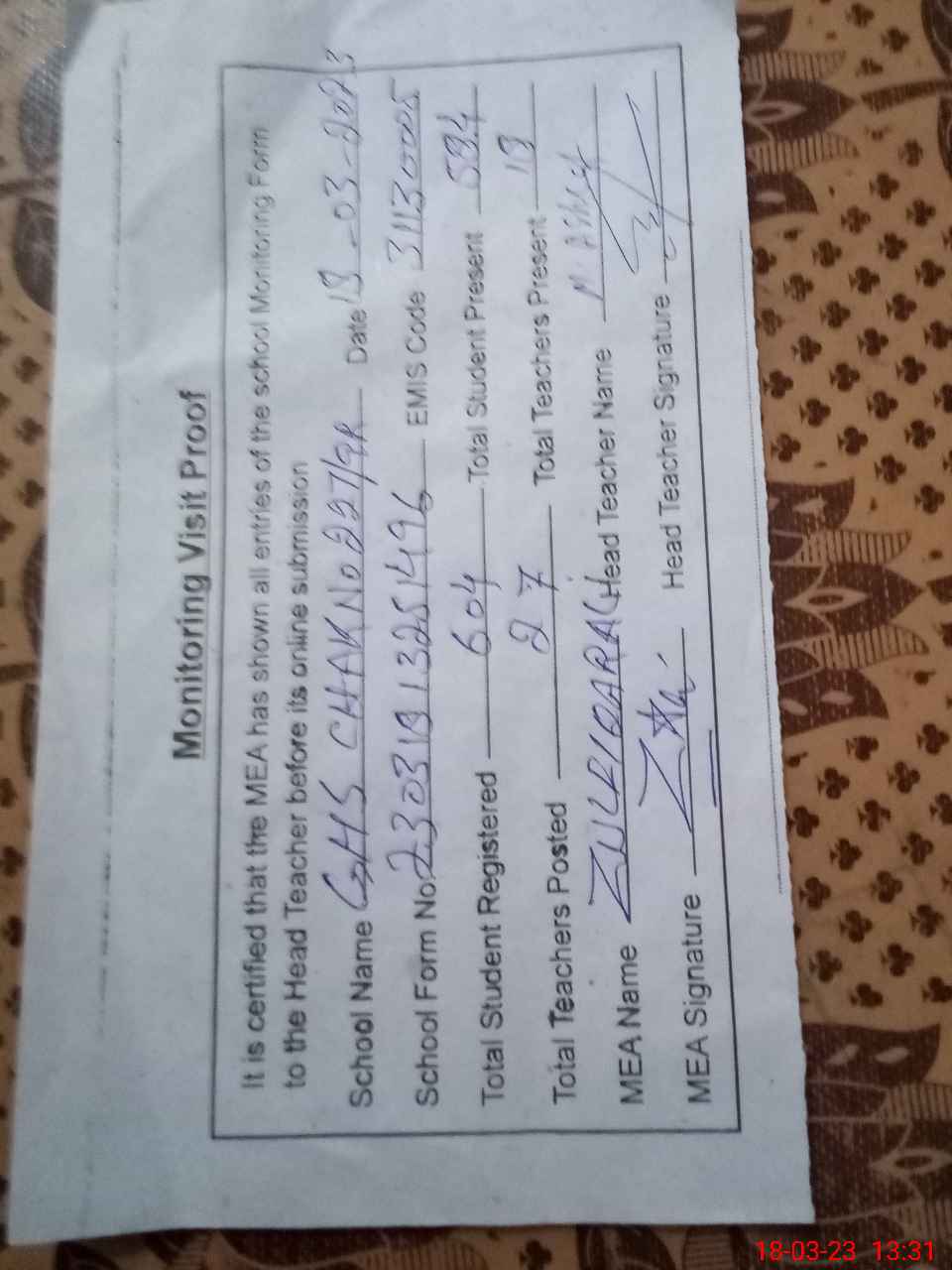 | Attendance Register | Head Teacher | MEA with School | Visit Proof |