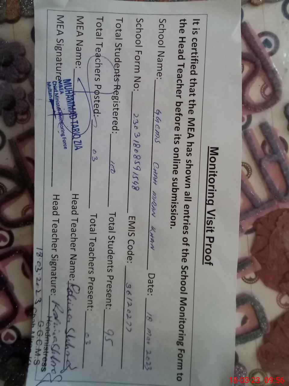 | Attendance Register | Head Teacher | MEA with School | Visit Proof |