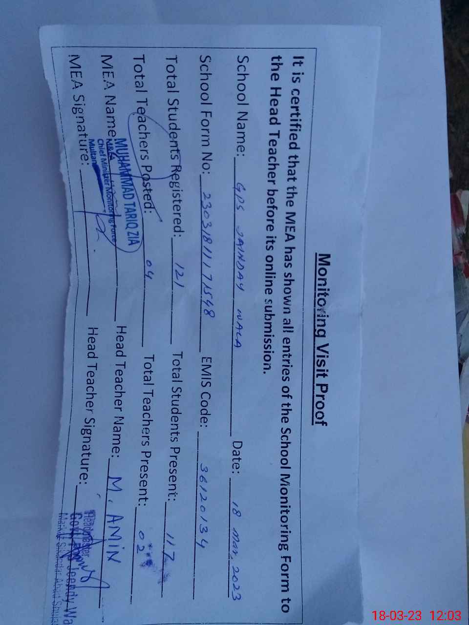 | Attendance Register | Head Teacher | MEA with School | Visit Proof |