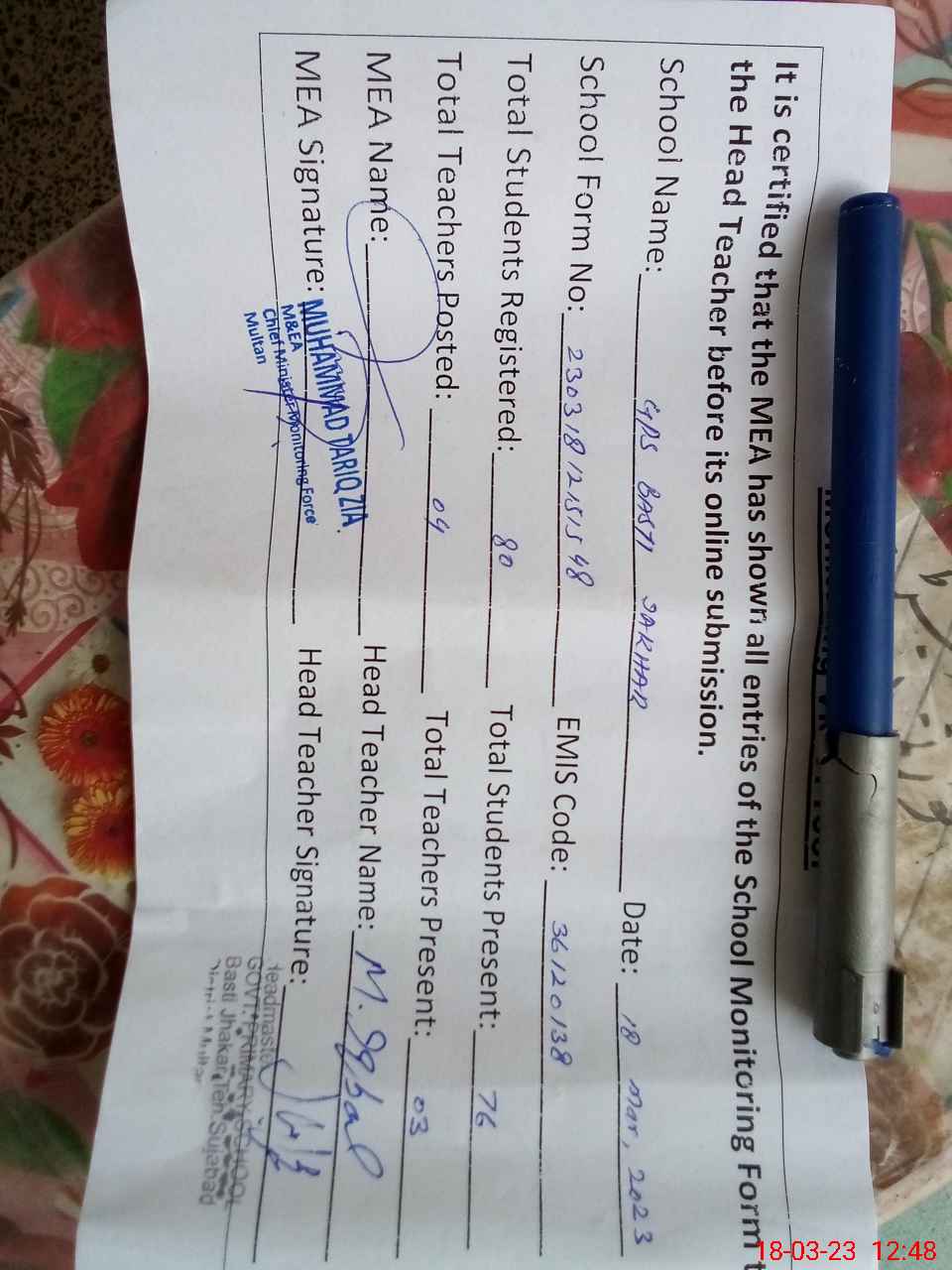 | Name: Ar**** Ja**** Designation: (School Headmaster's/Headmistress's) HEADMASTER Phone/Cell Number: 03**** |