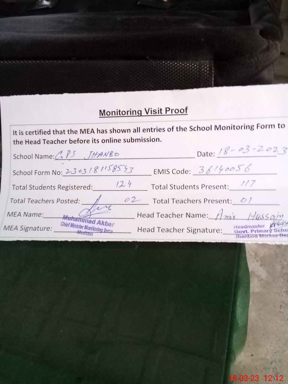 | Attendance Register | Head Teacher | MEA with School | Visit Proof |