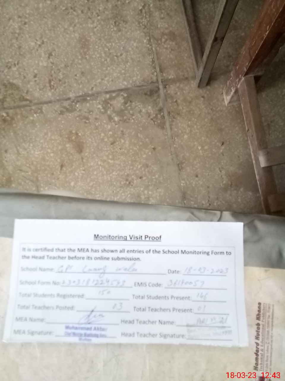 | Attendance Register | Head Teacher | MEA with School | Visit Proof |