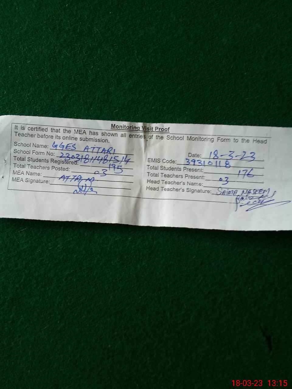 | Attendance Register | Head Teacher | MEA with School | Visit Proof |
