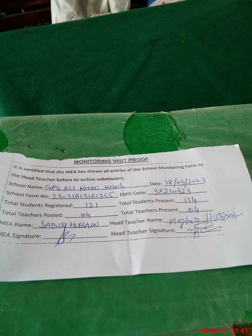 | Attendance Register | Head Teacher | MEA with School | Visit Proof |