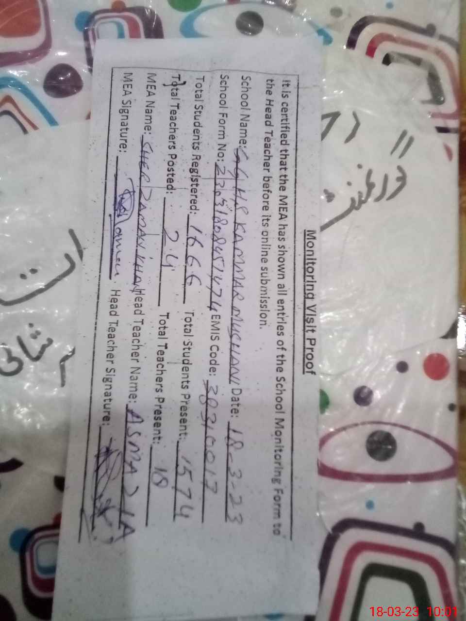 | Attendance Register | Head Teacher | MEA with School | Visit Proof |
