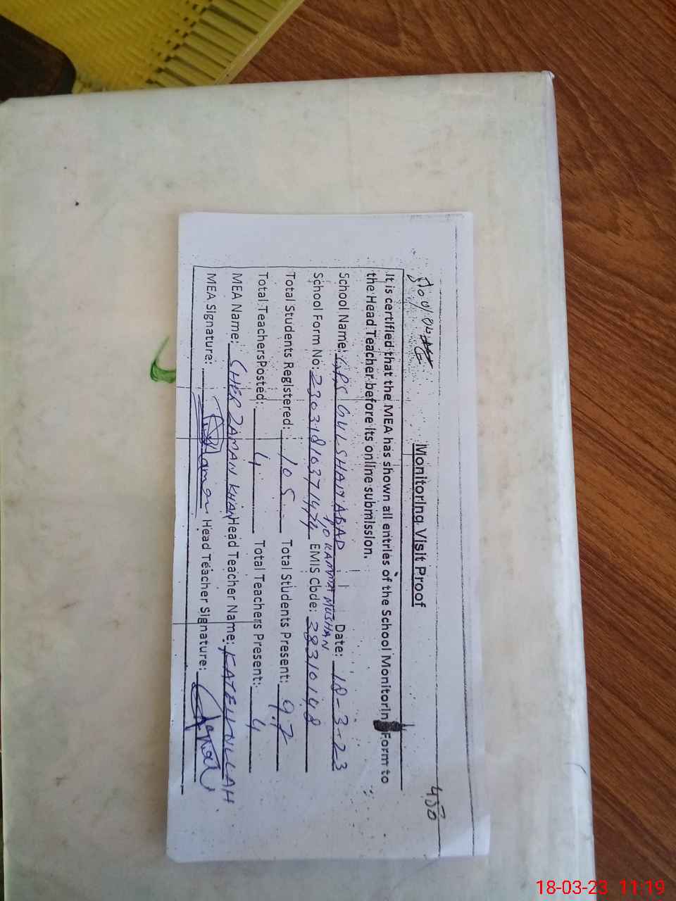 | Attendance Register | Head Teacher | MEA with School | Visit Proof |