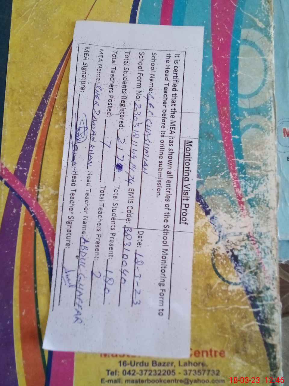| Attendance Register | Head Teacher | MEA with School | Visit Proof |