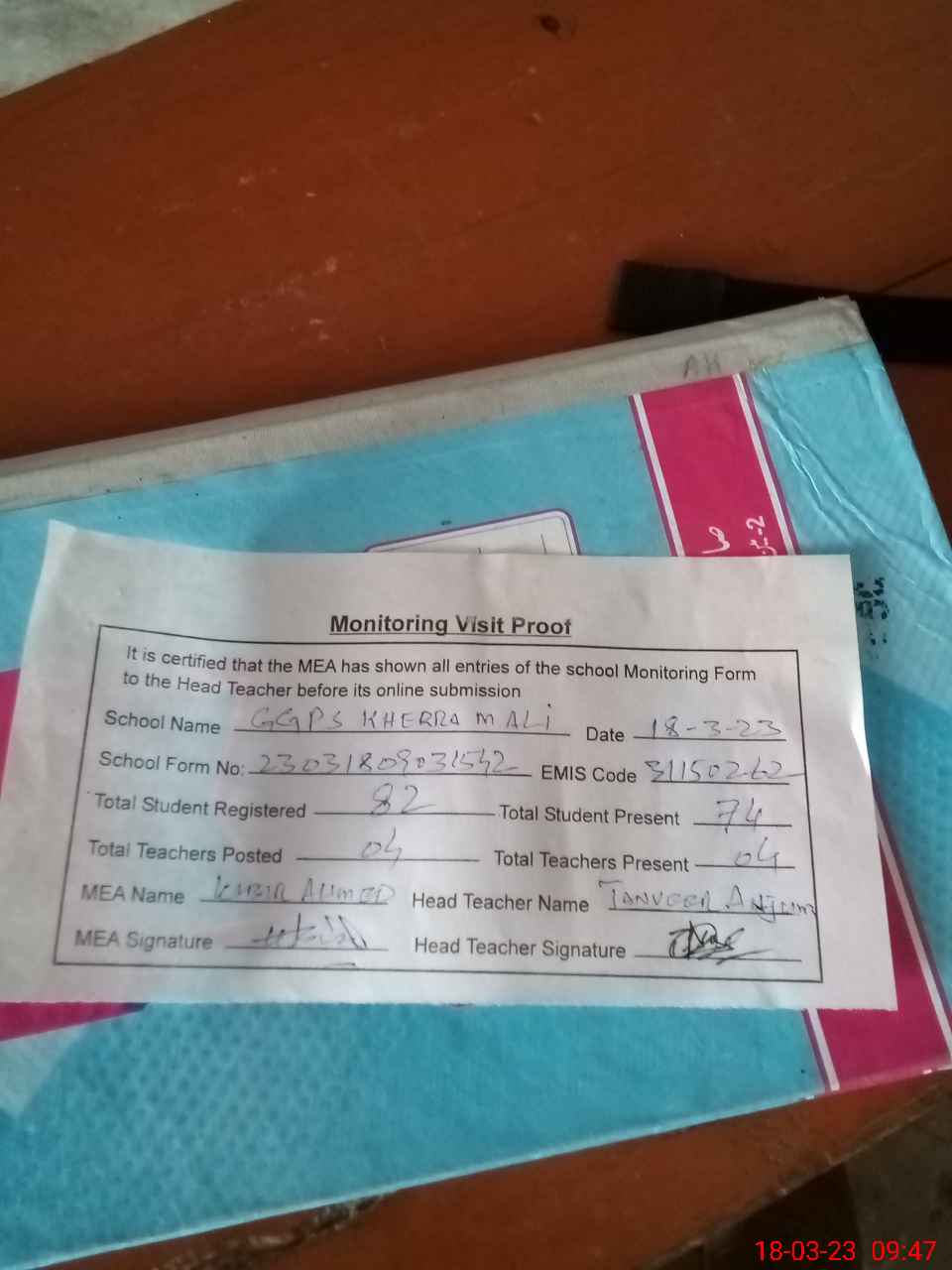| Attendance Register | Head Teacher | MEA with School | Visit Proof |