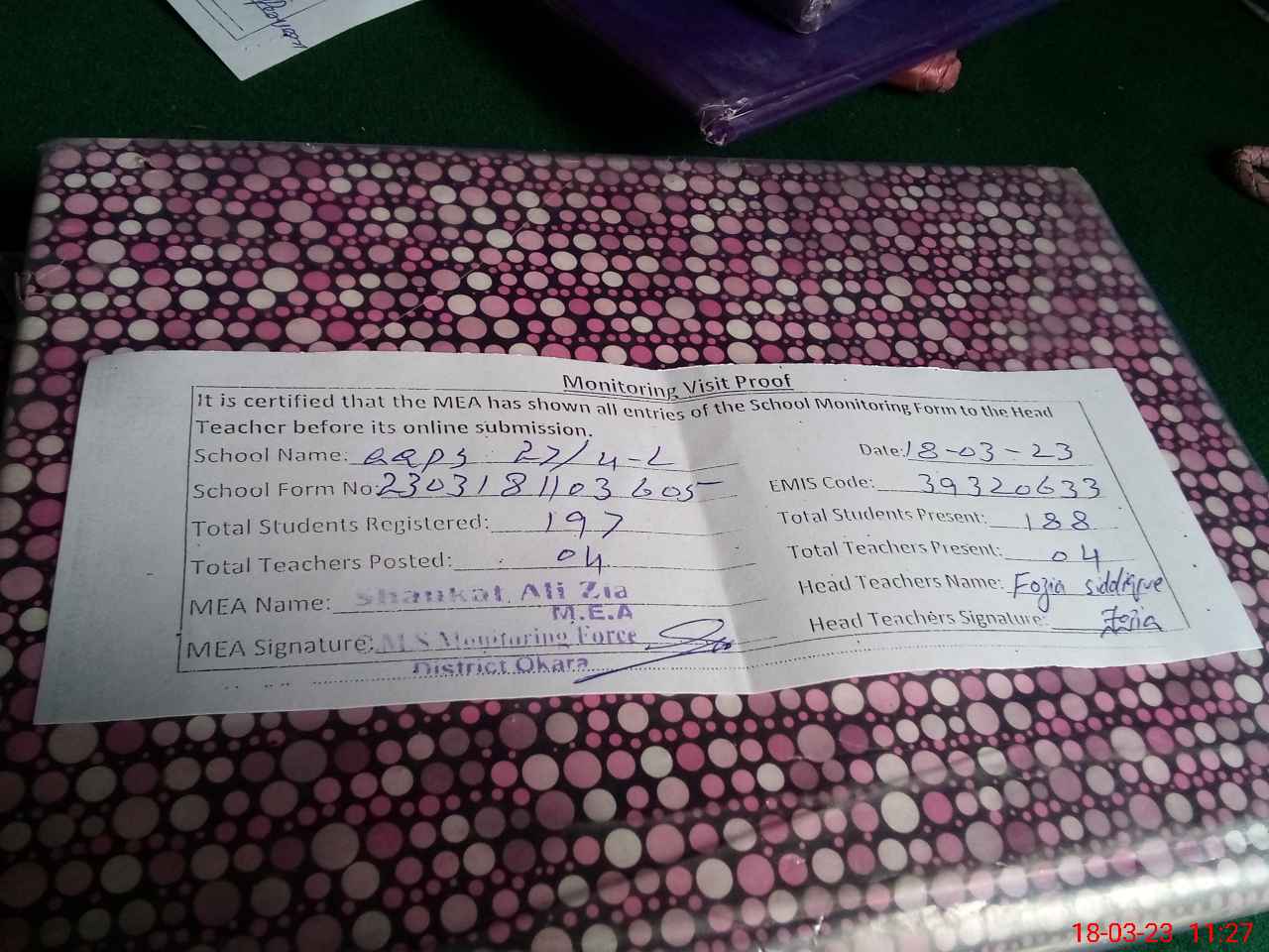 | Attendance Register | Head Teacher | MEA with School | Visit Proof |